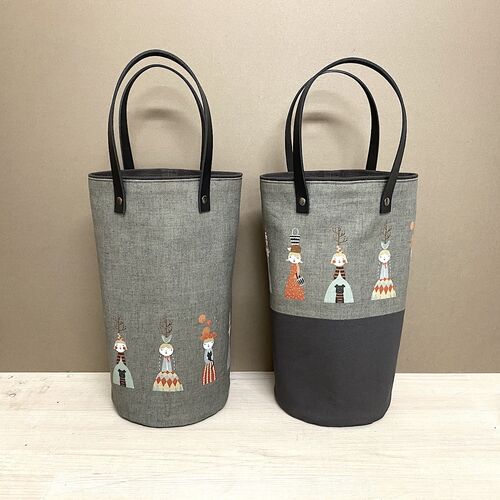 先日入荷のお知らせをしたFive Girlsのグレーバージョンの生地で まずはワインバッグを作りました。 先月お試し分の生地で作ったのと同じものです。 色合いも柄の大きさや密度も 今までの黒地のFive Girlsよりもかなり控えめになって そのぶん、おとなしめで…