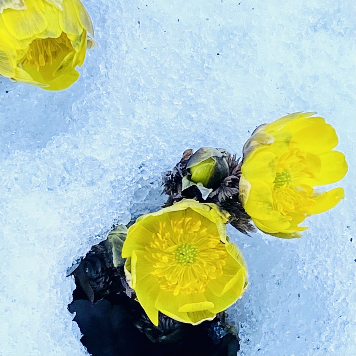 日陰の雪が残っているところで撮った雪と福寿草。